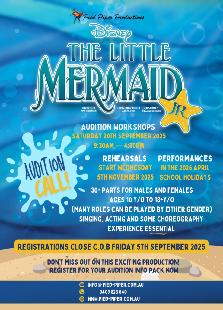 Sign up now for the upcoming auditions for the 2026 Pied Piper Production of The Little Mermaid Jr.